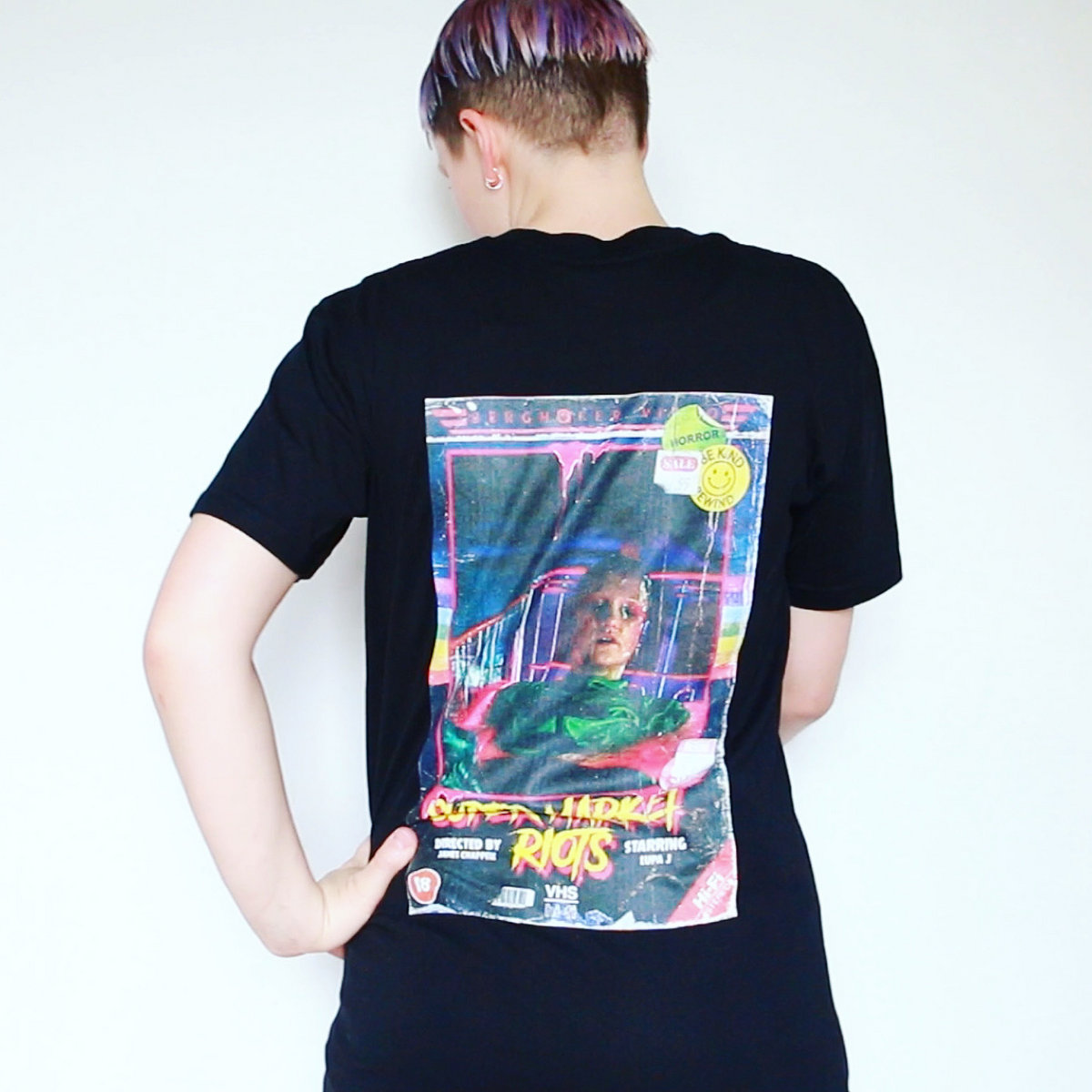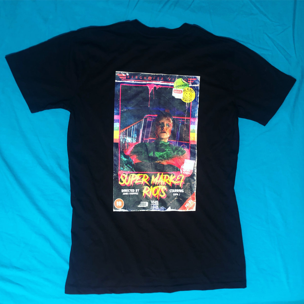 Supermarket Riots music video VHS design on 100% cotton AS Colour staple tee.